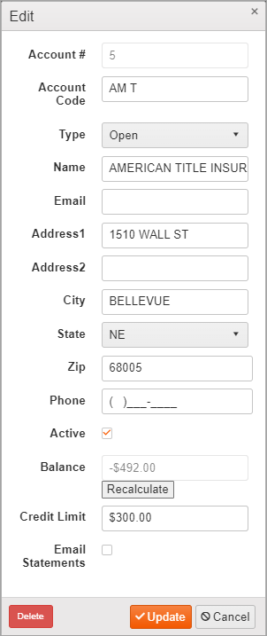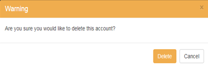 Use the Delete button to delete a customer’s account. Click Delete on the warning message to confirm the action.