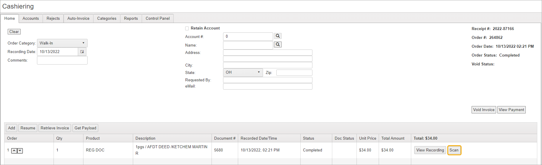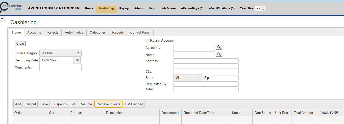On the Cashiering Home screen, click Retrieve Invoice.