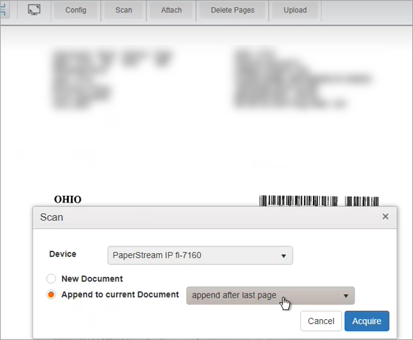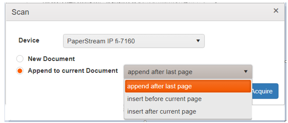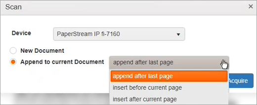 Now the scanner dialog defaults to “Append to current Document” and has dropdown options available.