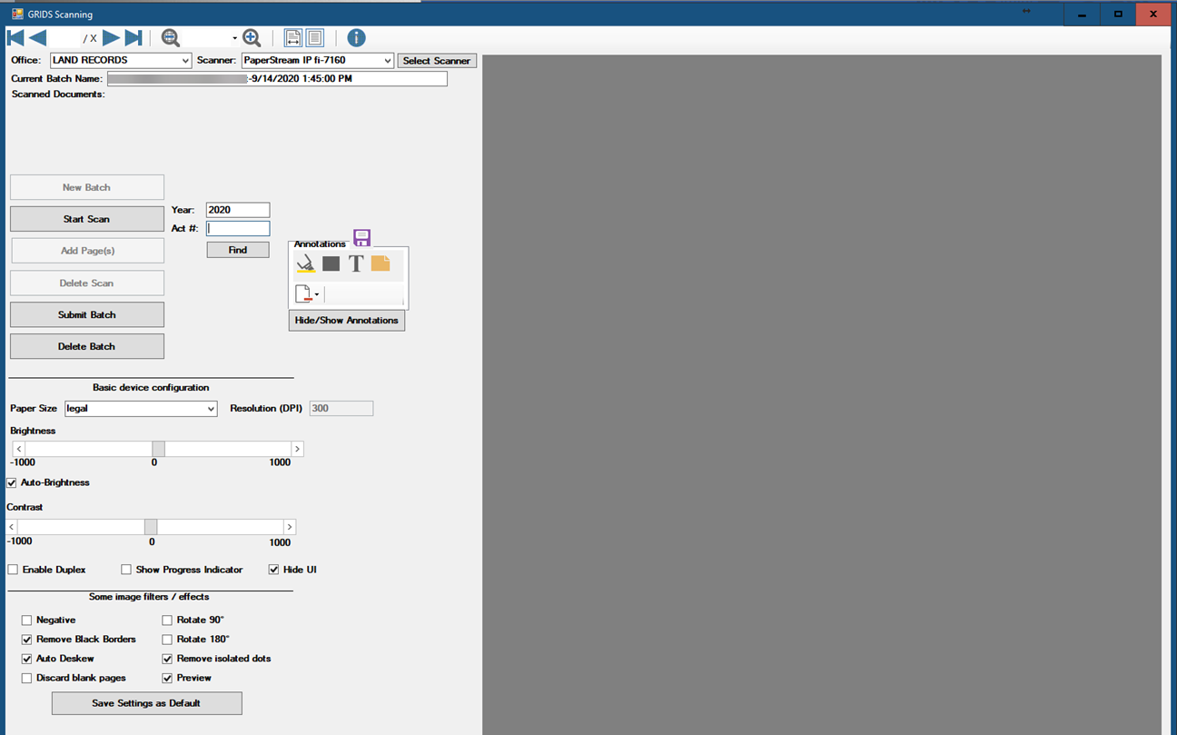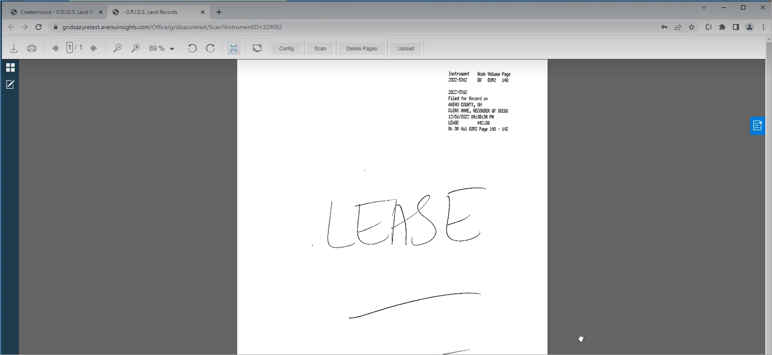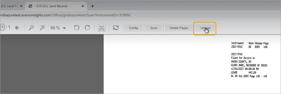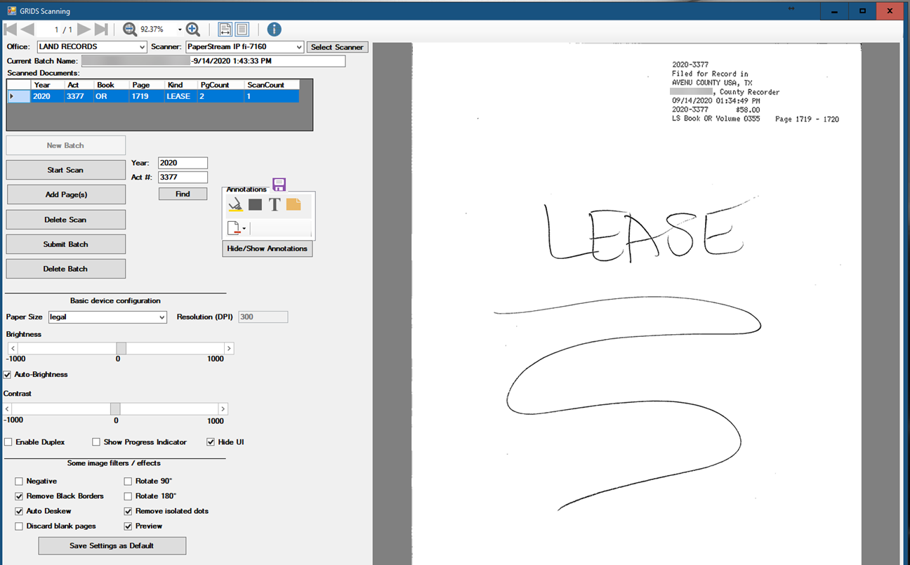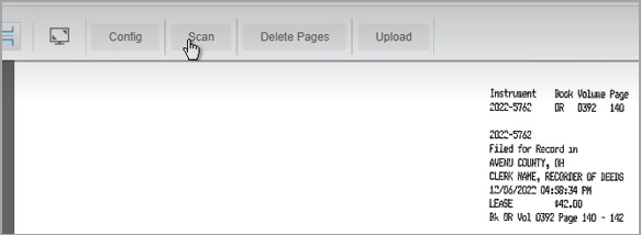 The document will appear in the window on the right of the settings. The scanning operation will count the number of pages that were scanned and compare that to the number recorded for the instrument. A message will about the page count discrepancy will appear if the two page counts do not match.