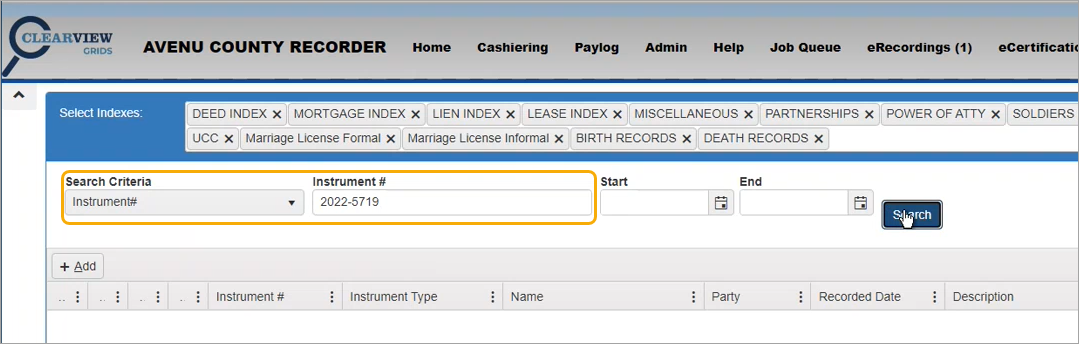 Enter the instrument number in the Act# box under the year.