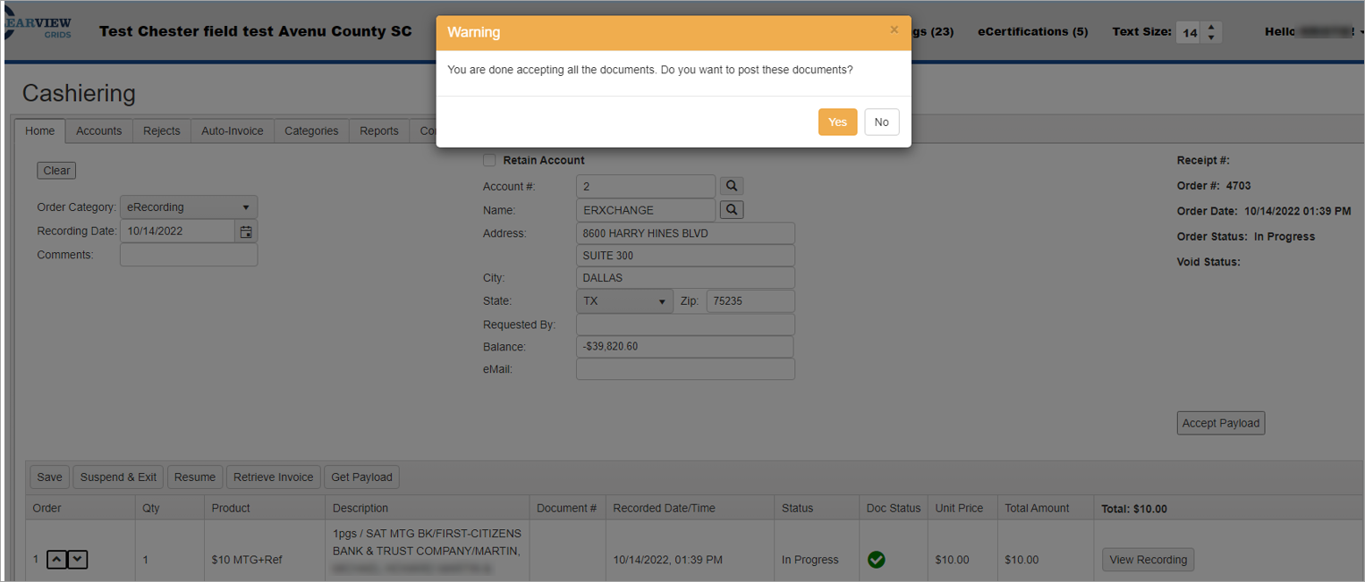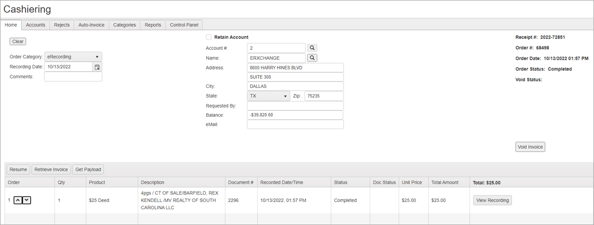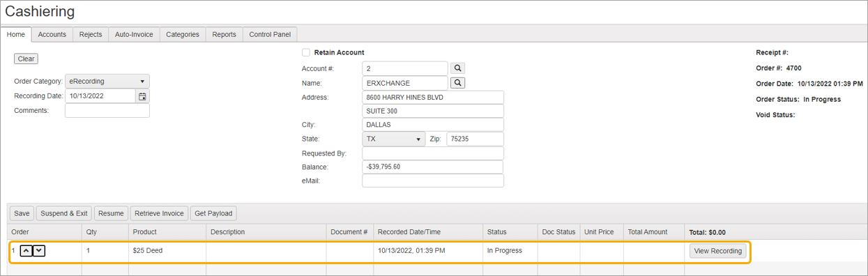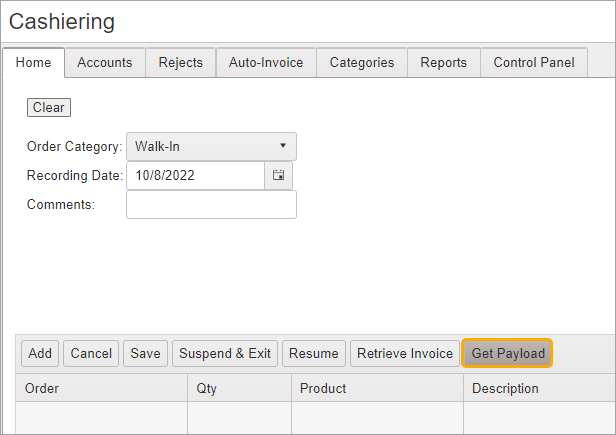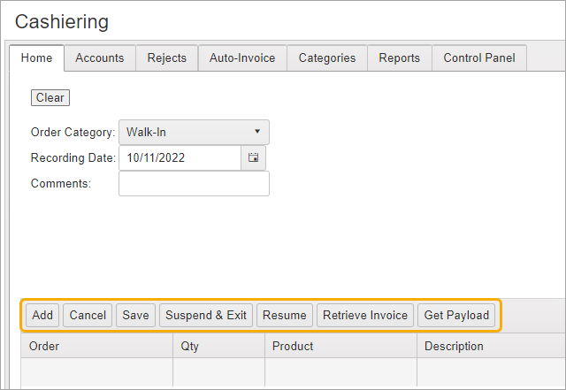 The Cashiering Home tab grid buttons provide additional functionality when working with orders.