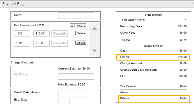 In the example below, two checks for $10 have been applied, but a balance of $14 remains.