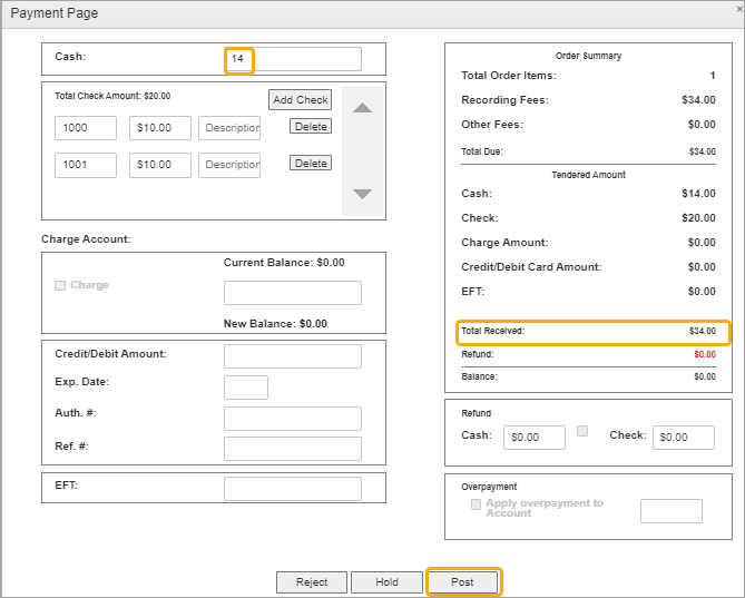 In this example, we’ll enter the remaining $14 as a cash payment. The Total Received immediately reflects the full amount has been received and the Post button is ready to click.